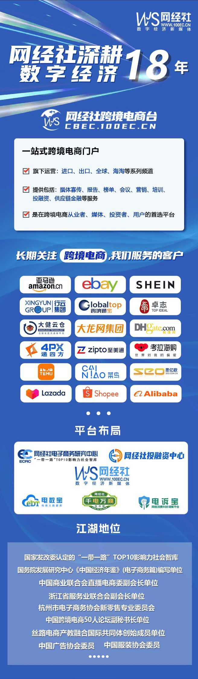 网经社深耕数字经济行业18年,持久关心跨境电商,旗下跨境电商台报道、研究的客户:1)出口跨境电商:阿里巴巴国际坐、全球资本、中国制制网、敦煌网、大龙网、拓拉思、领工云商、大健云仓、宝信全球、全球商业通、亚马逊全球开店、eBay、Temu、TikTok Shop、全球速卖通、Shopee、Lazada、出口时代、联络互动、安克立异、华凯易佰、patpat、致欧科技、赛维时代、星商、吉宏股份、子不语、兰亭集势、三态股份、遨森电商、星徽股份、绿联科技、傲基科技、棒谷科技、浩方集团。2)进口跨境电商:行云集团、海弘集团、集采、候鸟、麦帮科技、福猫供应链、天猫国际、京东国际、洋葱集团、55海淘、亚马逊海外购、海拍客、KK集团、你好世界。3)跨境电商办事商:卓志集团、珊瑚跨境、世贸通、泛鼎国际、价之链、易芽、来赞宝、海比电商、纵腾集团、西邮物流、燕文物流、递四方、菜鸟国际、至美通、泛远国际、乐舱物流、华贸物流、安骏物流、飞盒跨境、海管家、驿玛科技、Paypal、PingPong、连连国际、空中云汇、派安盈、丰泊国际、Skyee、易宝领取、寻汇SUNRATE、豆沙包、智汇鹅、蚂蚁国际、义领取、拉卡拉、中盈跨境、领星、店匠、易仓科技、积加、店小秘、欧税通、马帮ERP、擎天全税通、易达云、易点全国、力盟科技、飞书深诺、思亿欧、卧兔收集、红毛猩猩、外贸等。